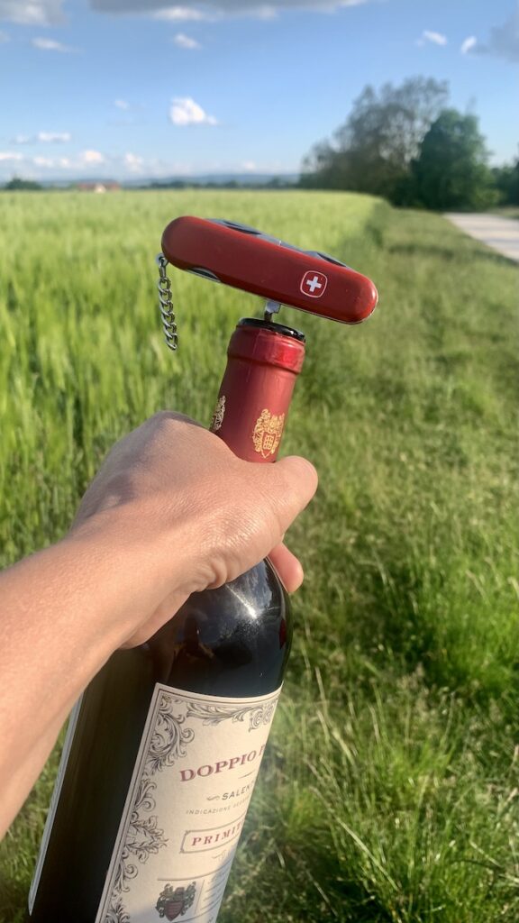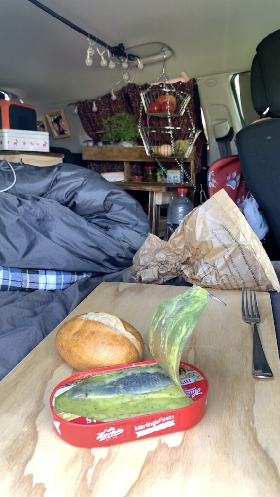 Den Nachmittag und Abend verbrachte ich in meinem Garten – dem Grünstreifen am Kornfeld. Ich las, bastelte mir neue Befestigungen und lauschte dem Zirpen der Grillen. Ich mampfte ganz feudal eine Dose Fisch, öffnete eine Flasche Wein und freute mich einfach da zu sein 😊.