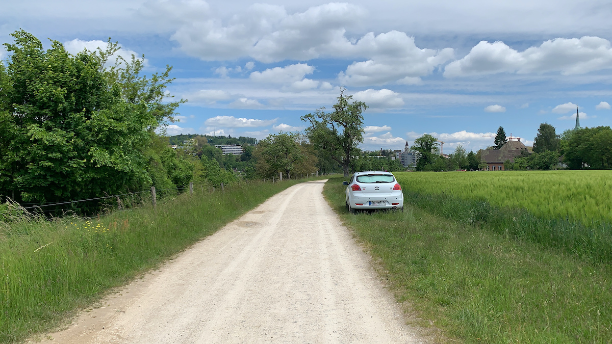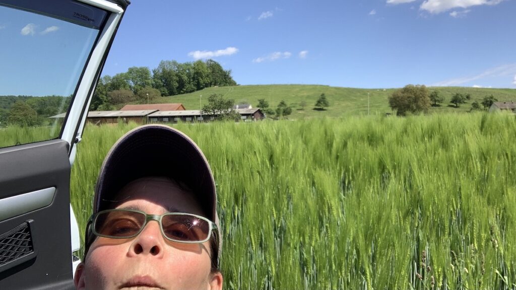 Mein heutiger Platz in Schaffhausen ist regelrecht um die Ecke vom Rheinfall und direkt neben einem Kornfeld. Kein Schatten, aber für nachts ist das zunächst egal, denn so heiß ist es ja noch nicht. Meine Milch parkte ich aber trotzdem unter dem Auto. Bio-Kühlschrank 😁!