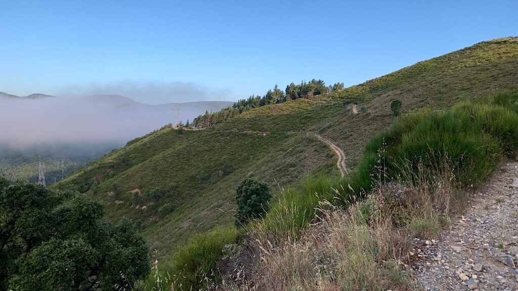 Und wie schon erwähnt, beginnt der erste steile Aufstieg direkt hinter der Herberge. Zu Anfang ist es nur eine kleine, sehr steile enge Straße, und ich finde es bemerkenswert, daß hier noch Häuser stehen. Schon bald wird aber die Straße zum Schotterweg, der so steil ist, daß es mich mit meinem Rucksack fast nach hinten zieht. Und um meine eigene Frage von gestern Abend zu beantworten, ja, offensichtlich haben wir den nötigen Elan, denn nach etwa einer Stunde sind wir über den Wolken.