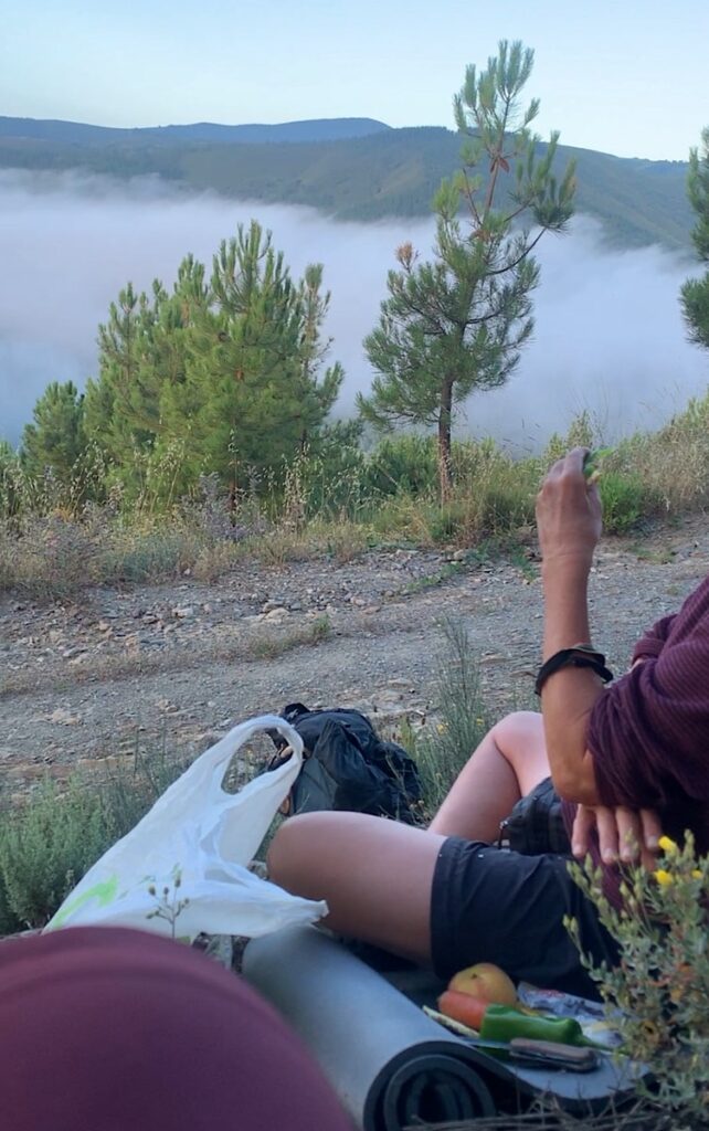 Als sich mein Kopfkino beruhigt hat und ich wieder einen Blick für die Schönheit des Weges habe, schlage ich vor zu frühstücken. Wir finden auch schnell ein idyllisches Plätzchen am Waldrand und klettern ein Stück den Hang hinauf. Wie gut, daß wir unsere Isomatten haben, der Boden ist arg klamm, und es ist generell etwas frisch hier oben, aber die Aussicht ist fantastisch! Ich mampfe den Ziegenkäse, den ich mir gestern im Supermarkt gekauft habe, einen Joghurt und etwas Brot. Ein Kaffee wäre jetzt das Highlight, aber leider habe ich meinen Minikocher nicht mehr. Damit könnte ich uns jetzt einen schönen heißen Kaffee zaubern. Aber gut, stilles Kranwasser hat auch seine Reize.