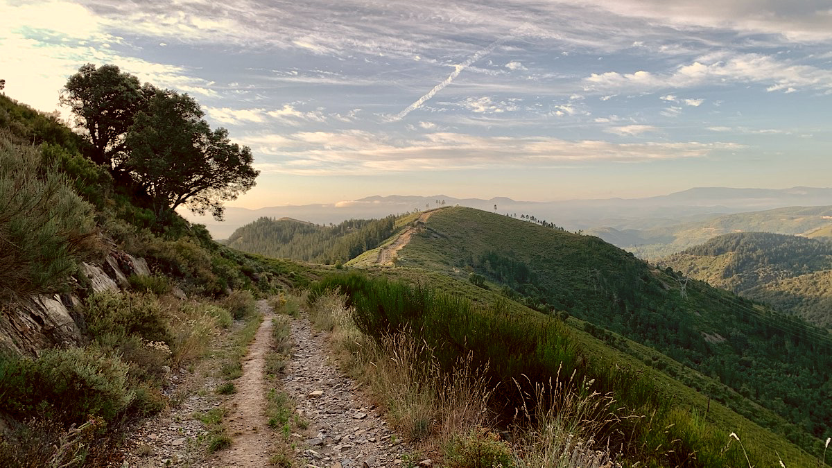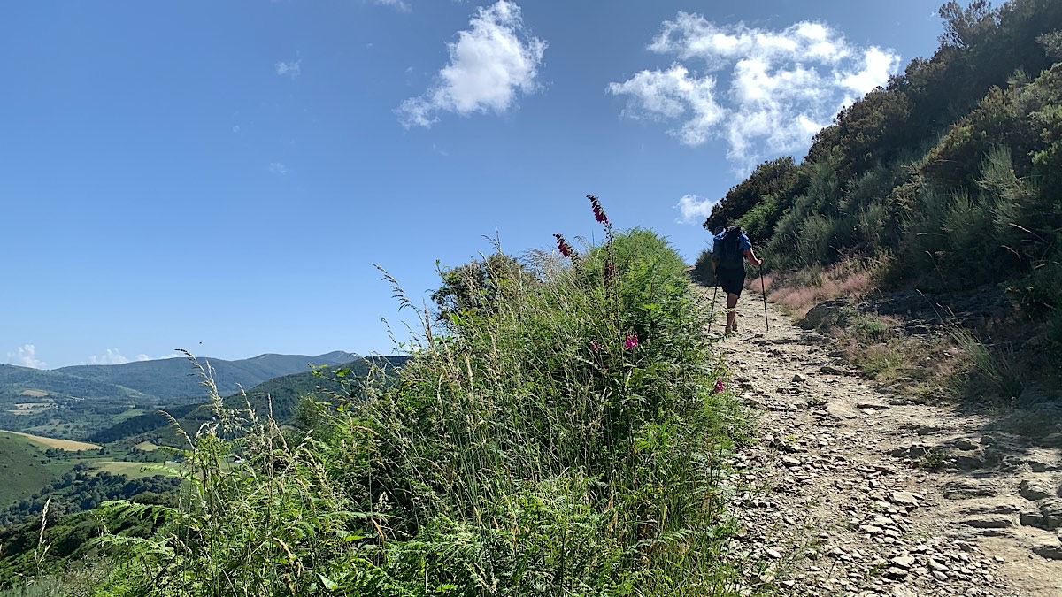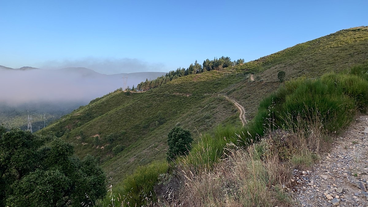 Nach acht Kilometern müssen wir den schönen Höhenweg leider verlassen und nach Trabadelo absteigen, wo wir wieder auf die Normalroute stoßen. Aber wo ist der Weg? Zwar sehen wir den ein oder anderen gelben Pfeil, aber es ist nie so ganz klar, ob sie den Weg markieren oder den ahnungslosen Pilger zu irgendeiner Bar in Pradela lotsen. Wir irren querfeldein und erschrecken einen Waldarbeiter fast zu Tode, der uns aufgrund seines Hörschutzes erst sieht, als wir neben ihm aus dem Gebüsch springen. Der verstörte Mann weist uns den Weg in eine Richtung, die auch mein GPS bestätigt, so daß wir bald auf dem richtigen Trampelpfad runter nach Trabadelo sind. Von dort blicken wir ins Tal auf die schreckliche Bundesstraße und hoffen, daß wir das schlimmste Teilstück auf unserer Bergtour umgangen haben, wohlwissend, daß wir jetzt auch noch eine ganze Weile entlang dieser Straße gehen müssen.