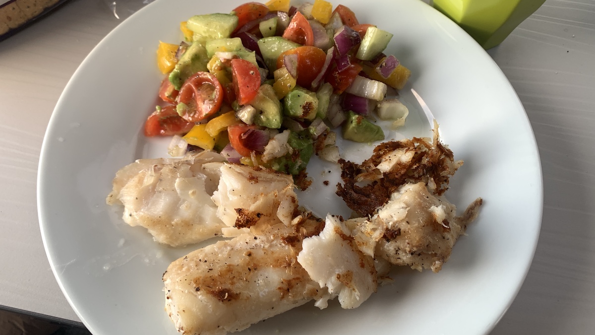 Heute Abend gab es in Butter gebratenen Kabeljau, Jakobsmuscheln und Black Pudding, dazu Salat.