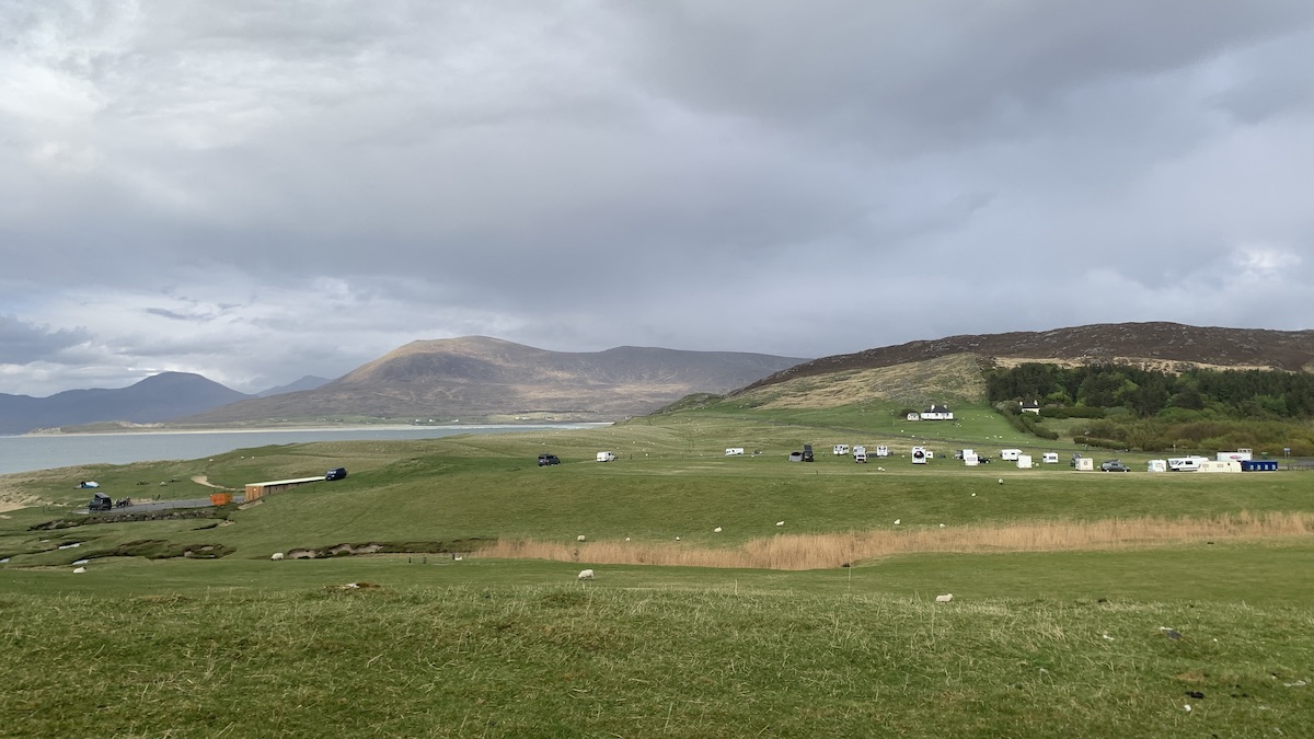 Unser neuer Campingplatz für die nächsten zwei Tage ist der Traigh Horgabost Caravan Park in South Harris. Wir haben hier keinen Strom und sind komplett autark. Und wir stehen wieder mal voll schief! Mir sind vorhin die Tomaten runter gefallen, die sind alle zur Tür gerollt. Aber wenigstens brauchte ich sie nicht lange suchen 😁.