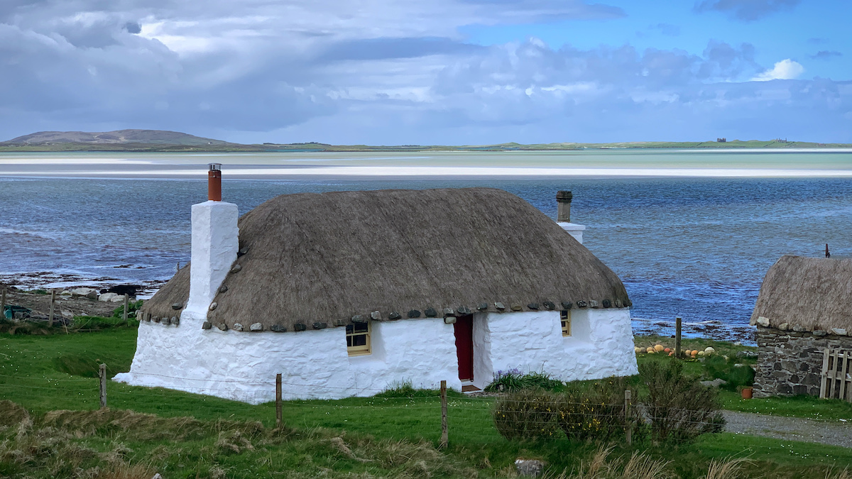 Nach einer vergeblichen Otter-Suche in der Nähe fuhren wir weiter Richtung Norden – wir immer hinter Di und Bert. Irgendwo zwischen Paible und Tigharry war eine Kirche mit unendlich vielen Autos, die da parkten. Da stand auch ein Polizei Auto, und wie David nunmal ist, hielt er an und fragte was hier los sei. Eine Polizisten erklärte, dies sei die Beerdigung einer „very popular person“, und ob wir zufällig da vorne links auf den Campingplatz wollten, denn wenn ja, so hätten wir Glück, denn gleich würde die Straße gesperrt. „Nein, nein“ sagt David, „wir fahren weiter zur Landspitze.“