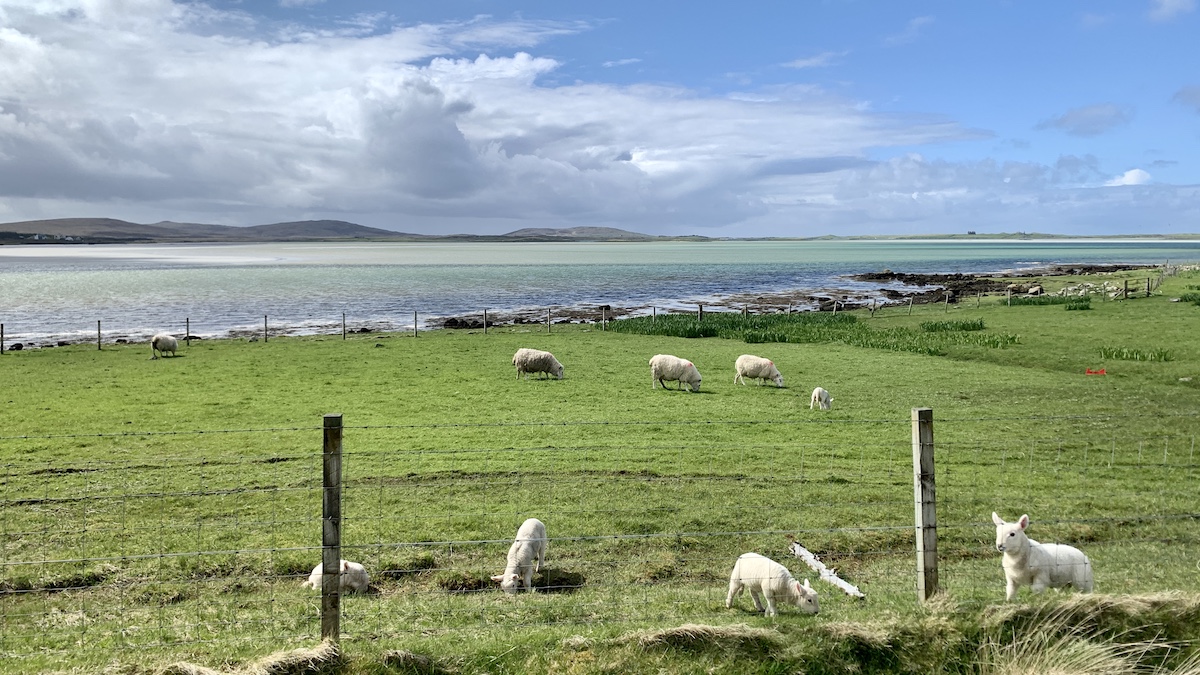 Wir fahren also weiter, sehen aber Di und Bert nicht mehr. Ich denke mir, ich frag mal auf WhatsApp nach wo die so sind, da kommt schon eine Nachricht: „Wir sind nach Balranald abgebogen“. Jetzt mußte ich erst mal gucken wo Balranald ist, fand es aber nicht. Da es aber nicht so viele Möglichkeiten gab abzubiegen, beschlossen wir umzudrehen und auf Schilder nach Balranald zu achten. Wir wendeten in 20 Zügen und kamen bald wieder in die Nähe der Kirche, da sahen wir schon das Polizeiauto die Straße blockieren und die Polizistin, wie sie eine Kolonne von 100 Fahrzeugen in eine bestimmte Richtung lotste: Baile Raghnaill. Das mußte der Gälische Name von Balranald sein, wo Di und Bertie abgebogen waren und jetzt auf uns warteten. Laut Wegweiser war dort ein Friedhof, und all die Leute, die in der Kirche waren, fuhren jetzt zur Bestattung. Wir kamen nicht hin und die beiden nicht zurück. Zum Glück hatten wir noch Zeit bis unsere Fähre in Berneray ab fuhr.