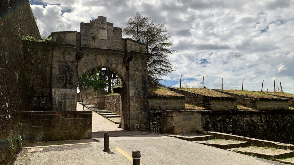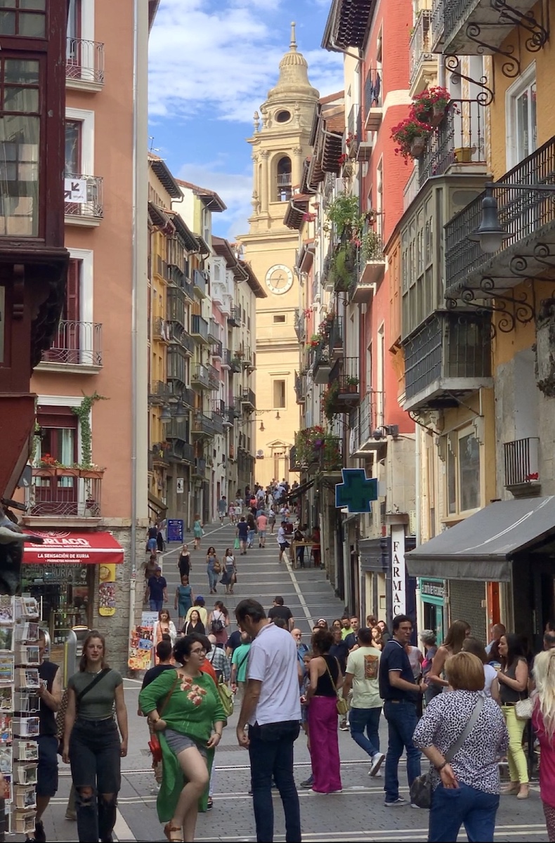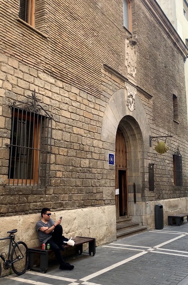 Nach Stunden der Qual erkenne ich eine Festung. Ich bin jetzt so nah an meinem Etappenziel und weiß es gar nicht. Ich erwarte hinter der Stadtmauer eine Kirche oder sowas wie einen Schlosshof, über den der Weg dann weiter geht. Stattdessen eröffnet sich vor mir die Altstadt von Pamplona. In dem Augenblick, in dem ich durch das Frankentor gehe, dem Puerta Fráncia, bin ich mitten im Geschehen. Ich bin umgeben von Bars, Einkaufsläden, Cafés und feiernden Menschenmassen. Damit habe ich nun gar nicht gerechnet. Gefühlt alle Einwohner Navarras tummeln sich in den engen Gassen der Pamploner Altstadt, und ich humpele mitten durch die Menge und weiß gar nicht wo ich überhaupt hin soll. Zelten kann ich hier natürlich nicht, deshalb steuere ich die erste große Herberge an, die ich sehe. Aber da hängt ein Schild, »Sorry, we are full«. Einer der Leute des Refugios schlägt mir die Herberge Jesús y María vor, die hätten bestimmt noch Platz. Die zweite links, die erste wieder rechts und dann sei ich da. Ich bete innerlich, daß noch was frei ist, ich kann einfach nicht mehr.